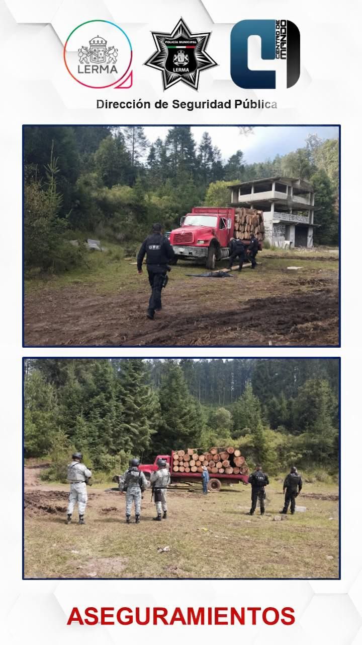 Lerma, Estado de México, 10 de septiembre de 2025.- En un operativo conjunto, la Dirección de Seguridad Pública de Lerma y la Guardia Nacional lograron el aseguramiento de dos camiones cargados con 34 troncos talados ilegalmente, así como una motosierra, en la comunidad de Salazar, Ameyalco.