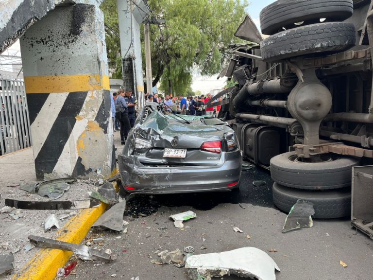 Un espectacular vuelco se registró esta tarde en el municipio de Tlalnepantla, luego de que un camion chocara y cayera sobre otro auto.