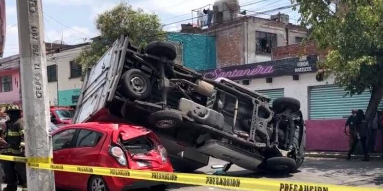 Esta tarde se registró un accidente en pleno centro de Toluca, cuando una camioneta volcó y cayó encima de un automóvil Spark que estaba estacionado.