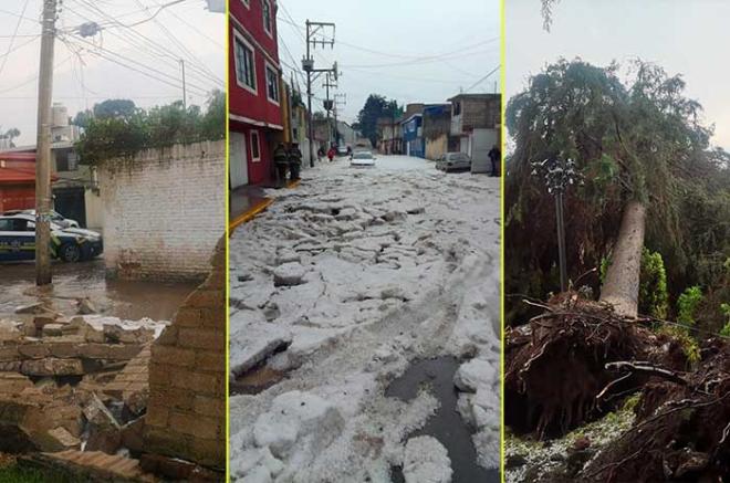 El reporte detalló la caída de árboles en diversos lugares, la techumbre de una bodega debido al peso del granizo, de una barda de aproximadamente 10 metros de longitud, automóviles varados por una importante concentración de granizo y cables al piso.