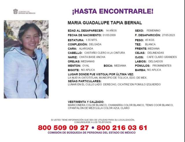 Desapareció la adolescente María Guadalupe Tapia Bernal en Toluca