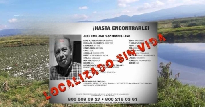 Juan Emiliano de 60 años de edad y originario de Temoaya, fue reportado por sus familiares como desaparecido desde el pasado domingo 10 de diciembre y tres días después fue hallado sin vida, en el mismo municipio.