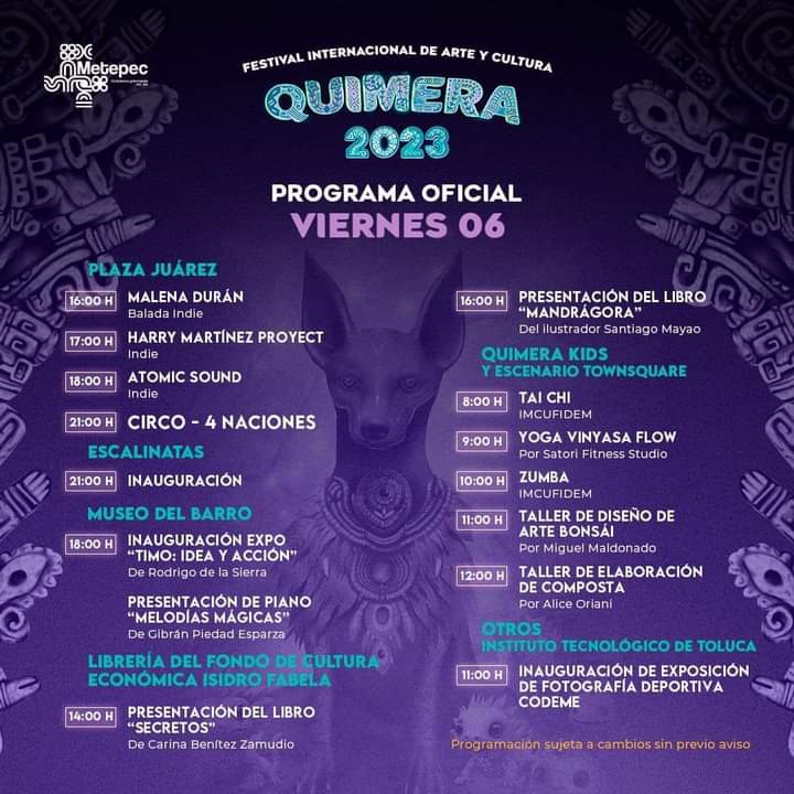 #Quimera2023, acompáñanos a vivir la cultura en todas sus formas.¡Los esperamos! Consulta todos los eventos que tenemos para ti y tu familia👇🏼👇🏼Vía Ayuntamiento Metepec