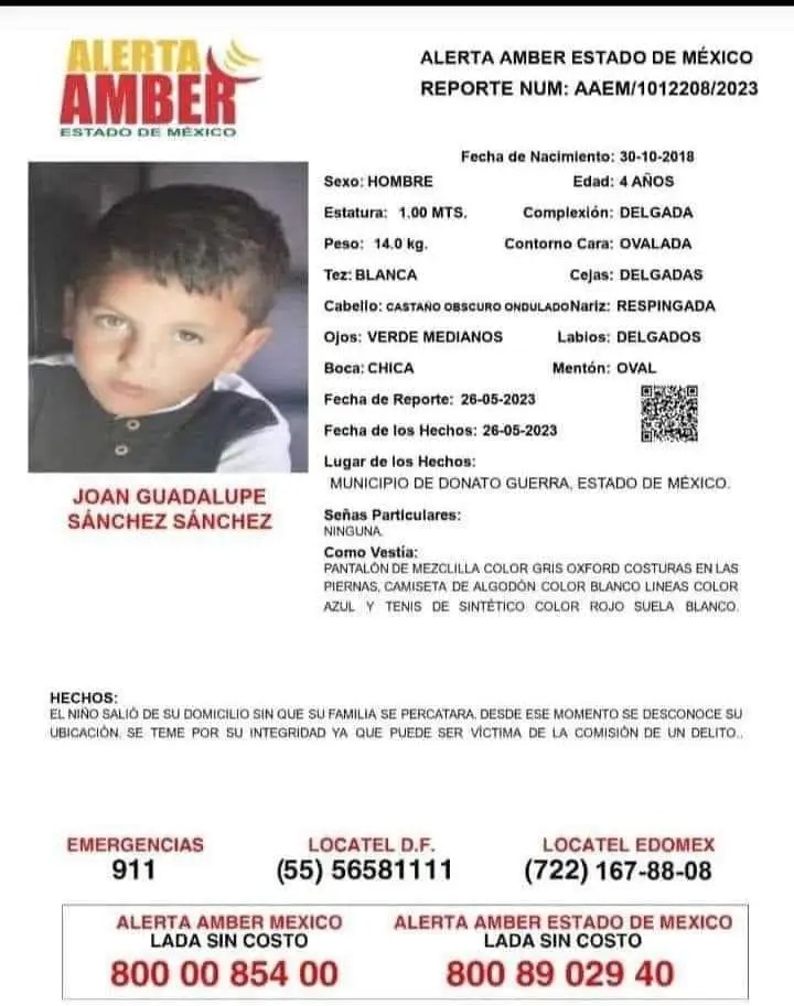 El bebé está desaparecido desde el 25 de mayo de este año. El último lugar donde fue visto fue el municipio mexicano de Donato Guerra.
