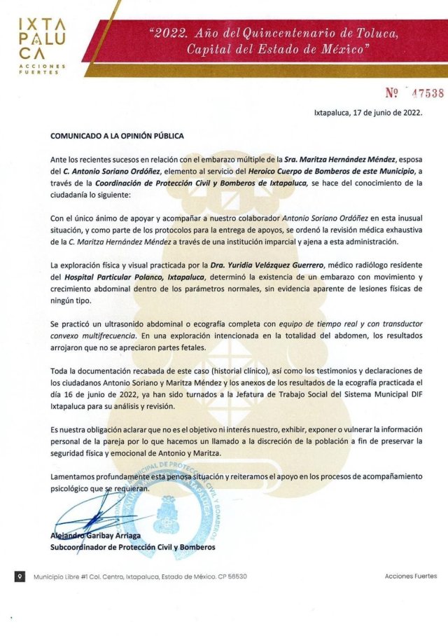 El gobierno municipal de Ixtapaluca negó el embarazo múltiple de 13 bebés entre una mujer y un bombero de esa localidad que habían anunciado hace dos días.