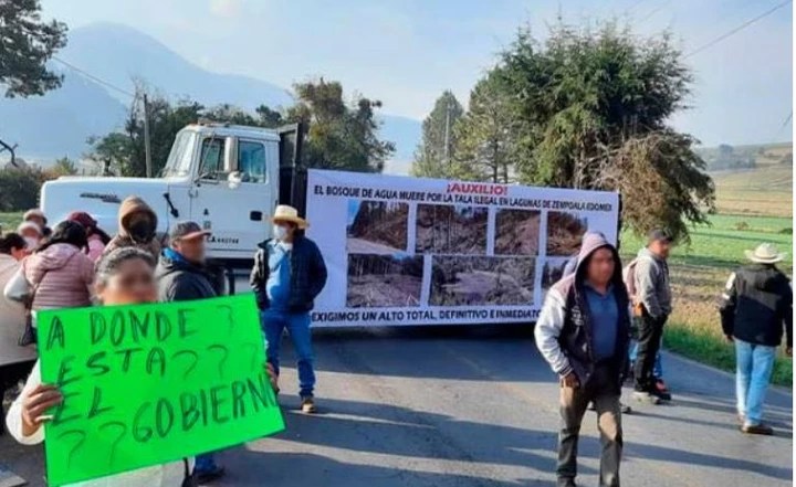 Vecinos del pueblo tlahuica de San Juan Atzingo impidieron el paso por la carretera Santiago-Chalma en protesta por la tala inmoderada que ha secado las lagunas de Zempoala y devastado los bosques.