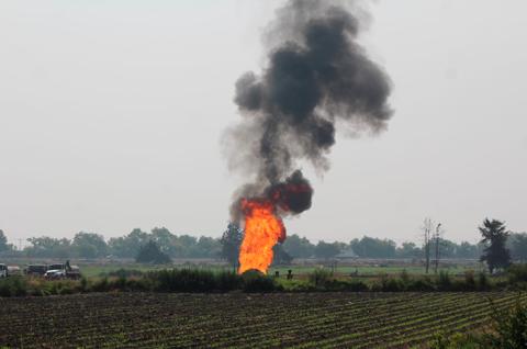 Los cuerpos de emergencia realizan una quema controlada de gas Lp que se esparció a causa de una fuga por una toma clandestina, en Nextlalpan.