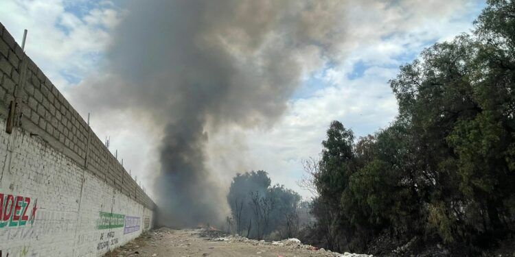 Un incendio consume parte de un tiradero clandestino de basura ubicado a un costado de la carretera federal México-Texcoco y genera una columna de humo negro de varios metros de altura.