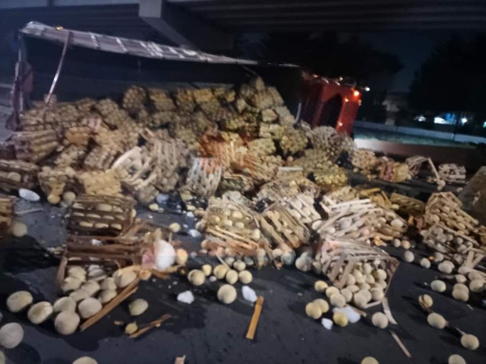 🚨La fruta quedó regada por todo el pavimento pero debido a la hora en que ocurrió el siniestro vial no se reportó rapiña.